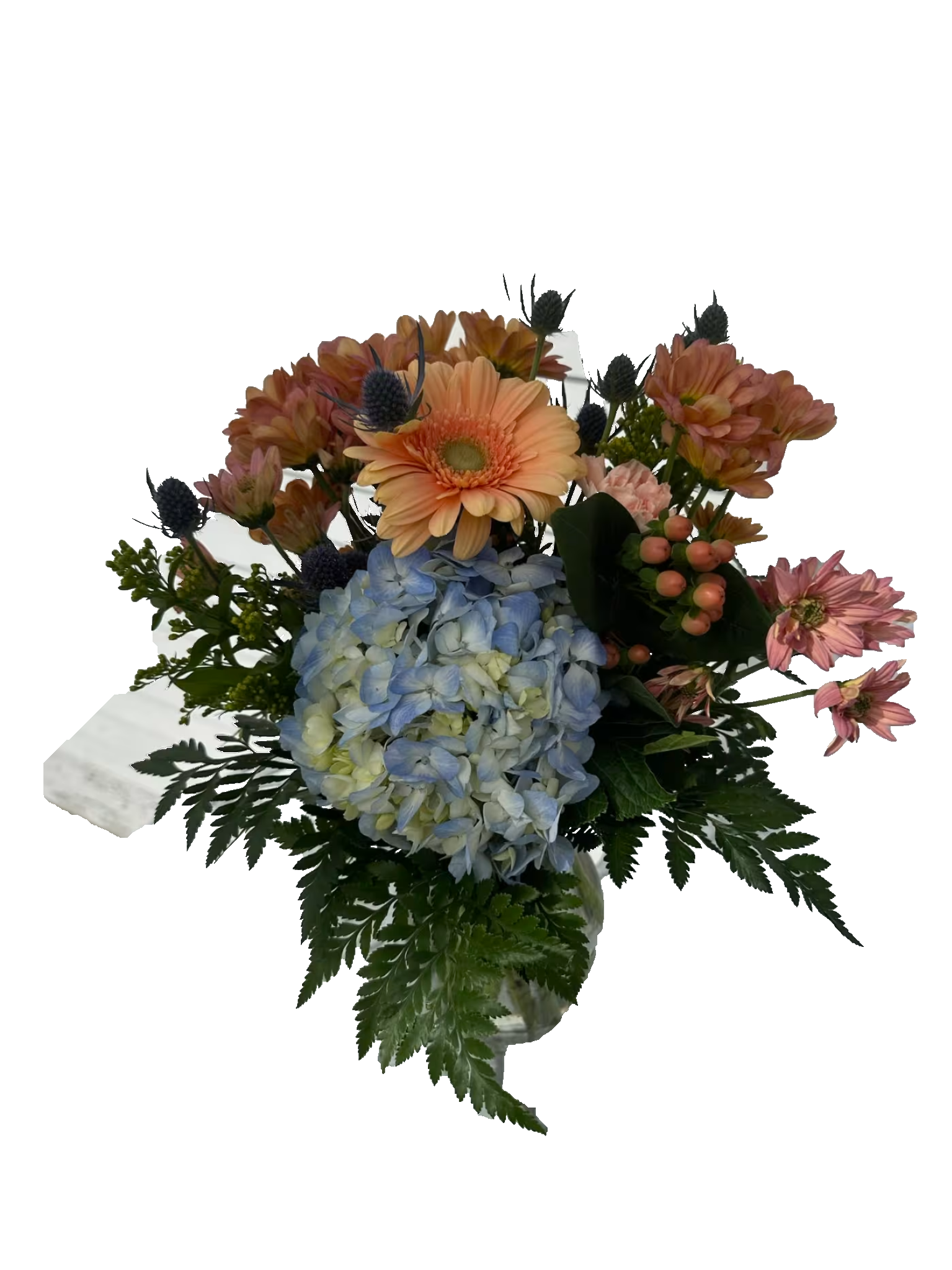 Blue hydrangea, peach gerbera daisys, hypericum berries and daisys arranged in vase