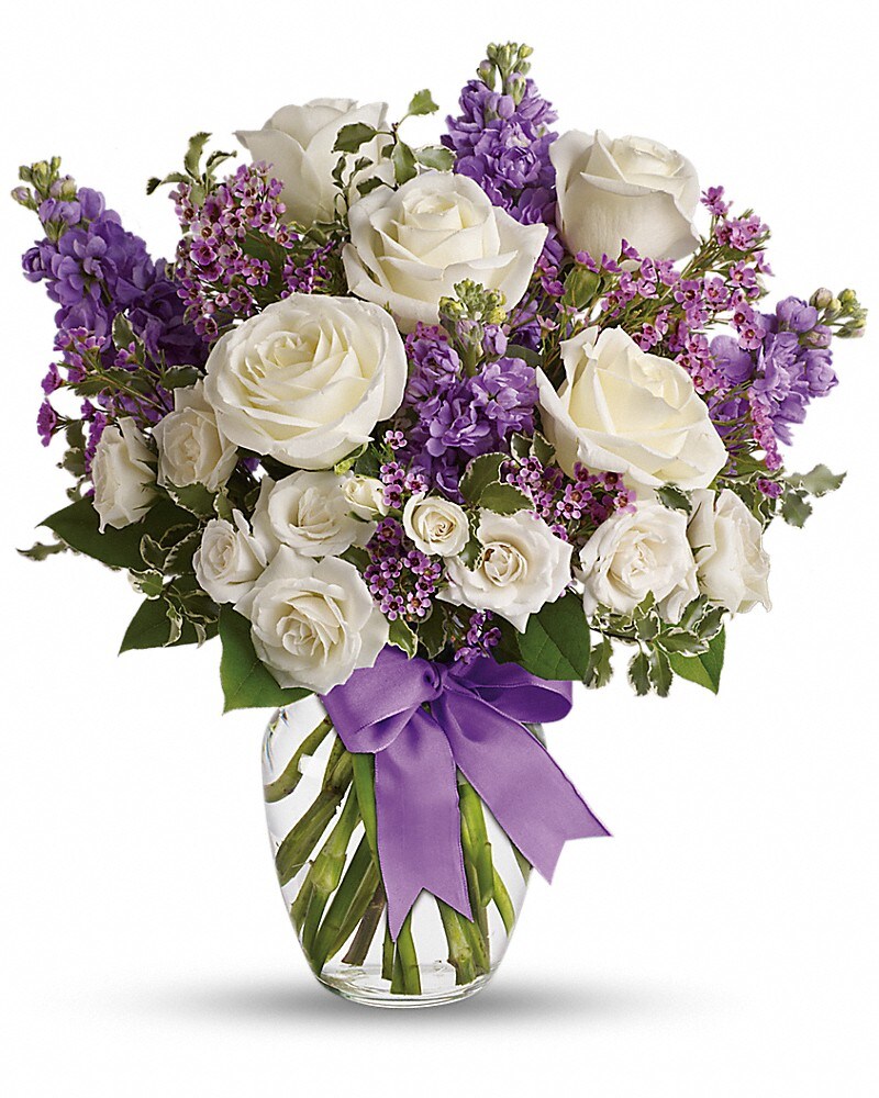 White roses and fragrant stock in lavender and purple arranged in a vase. This arrangement is an all-time favorite!