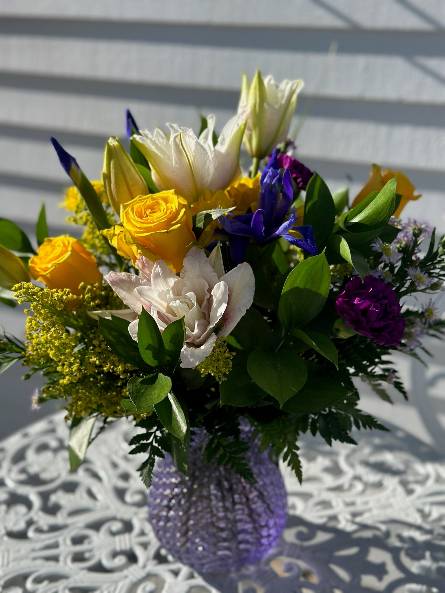 Pink Lilies, Yellow roses, daisies, iris, purple carnations and solidago arranged in a purple glass etched vase