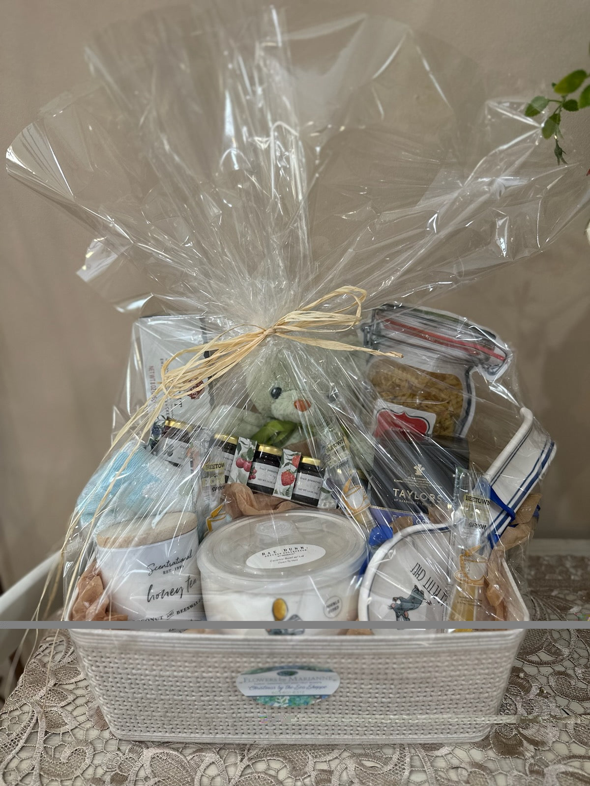 Our "bee well" gift basket contains a honey tea candle made of bee's wax and coconut, a ratatouille soup bowl and spoon rest, soup mix, betown honey spoons, Taylor's Earl Grey tea, crackers, a teddy bear, hand towel, and an assortment of preserves.