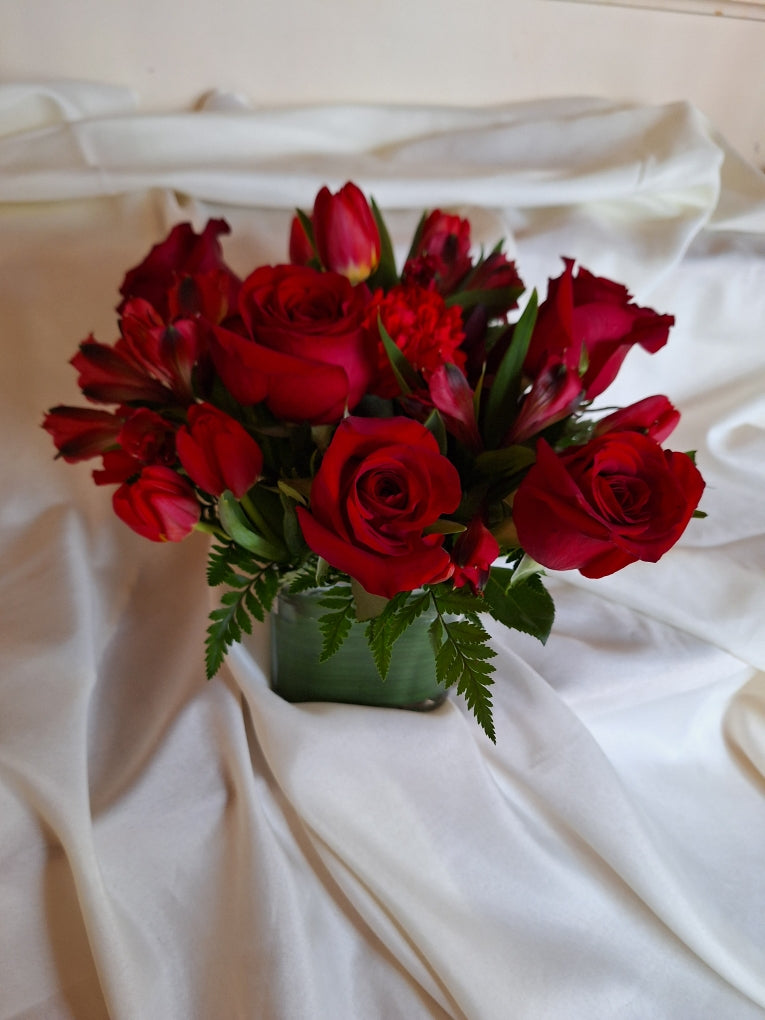 Roses, Tulips, Alstromeria and Carnations designed in a modern cube vase