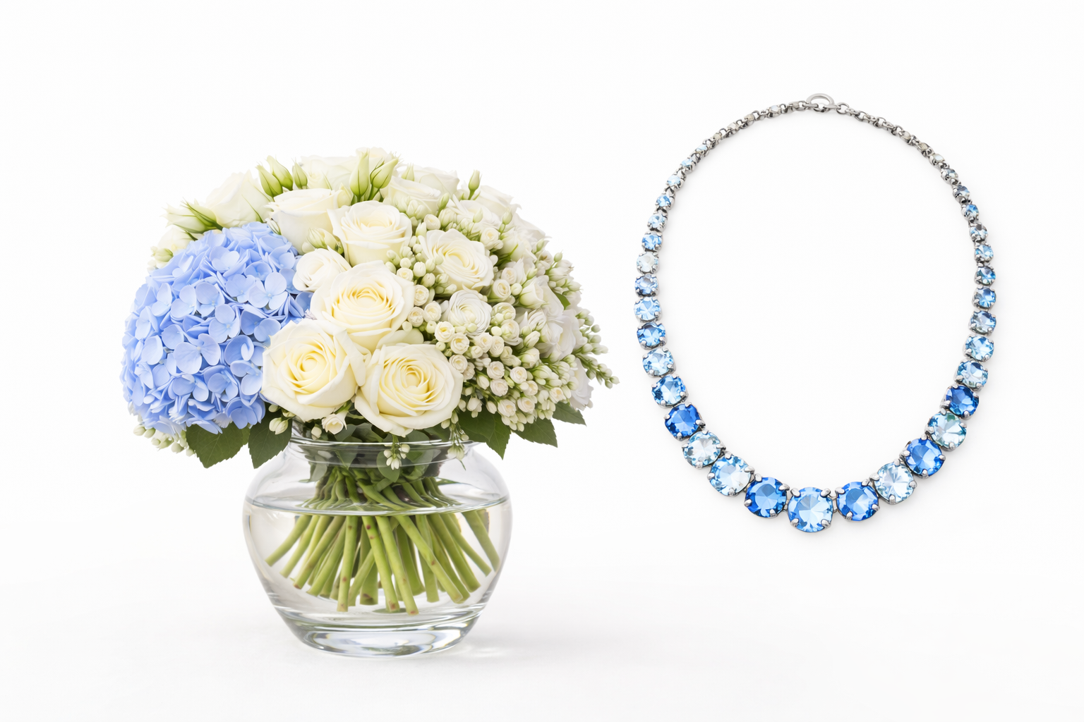 A fresh coastal - inspired Valentine's gift that blends soft florals with subtle sparkle. Includes blue hydrangea and white roses in a clear glass vase and Sorrelli fine jewelry earrings for Standard pricing